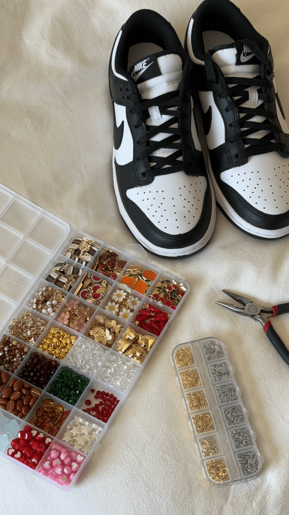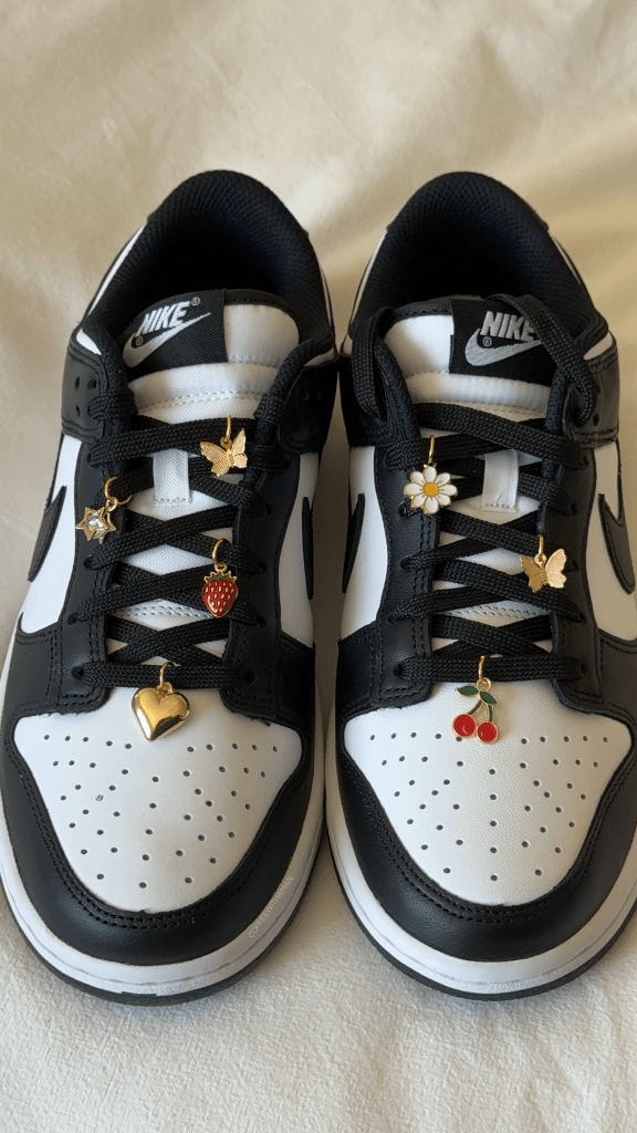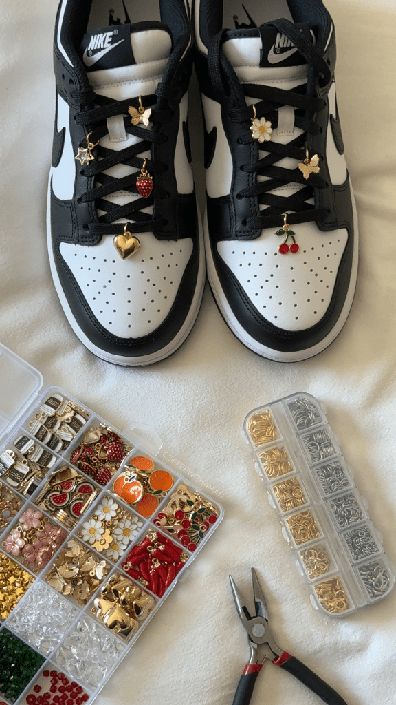It’s actually so easy! First thing I did was map out my charms, to see which layout I liked the best. Then I just looped a jump ring into the charm and placed it on the shoe string! The bigger the jump ring the more room it has to move, so the size of the jump ring totally depends on your preference!